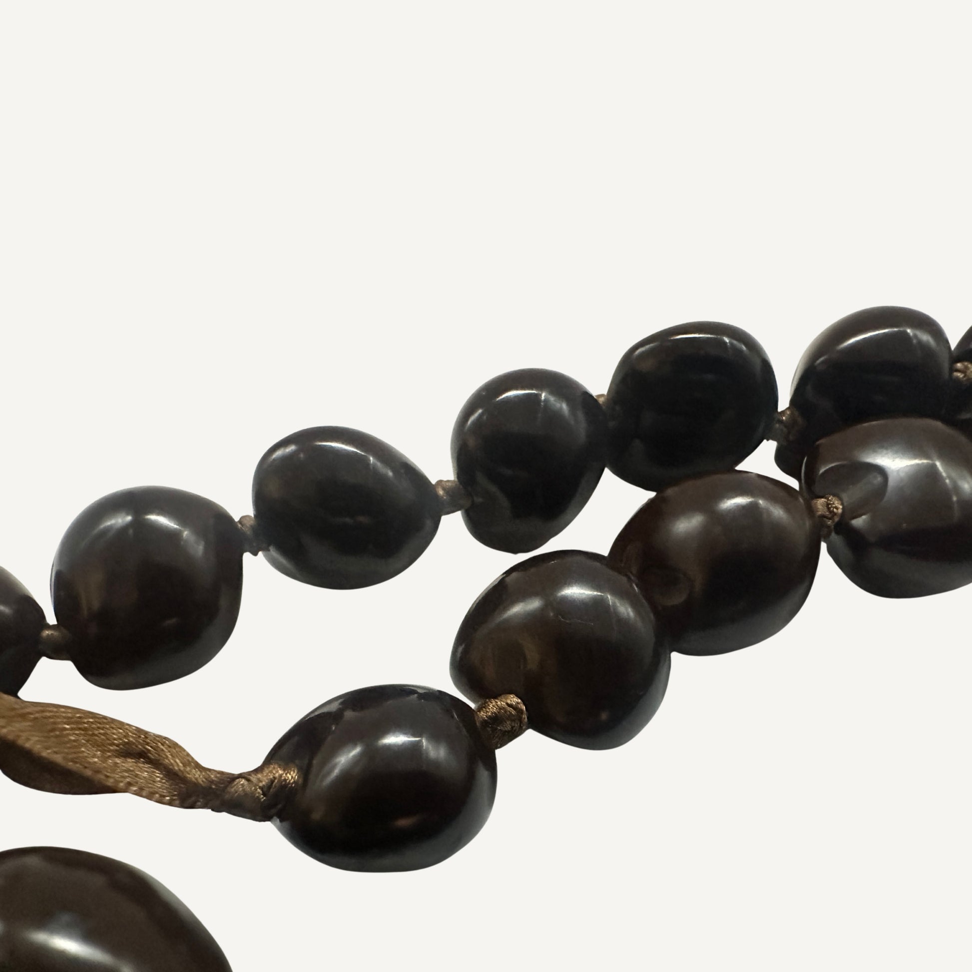 The Chocolate Covered Beads Necklace features glossy, rounded beads in a deep cocoa hue, strung together with an easy, relaxed rhythm. Finished with a soft fabric tie, it has that just-threw-it-on feeling—effortless, unfussy, and full of personality.