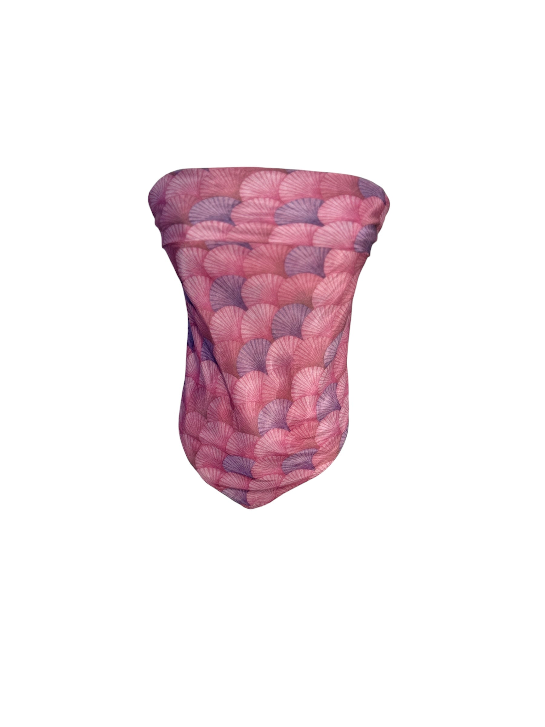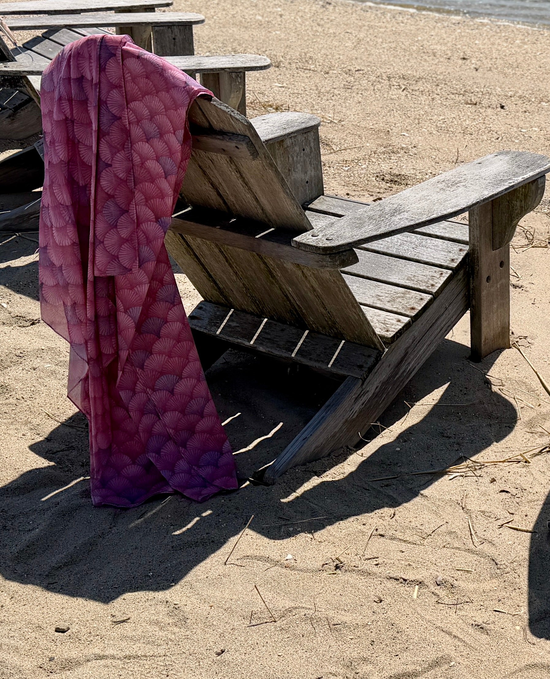 A delicate, repeating fan motif inspired by sunlit shells along the shoreline. Layered shades of soft pink and muted mauve create depth and movement, giving the print a luminous, almost iridescent feel. Feminine and timeless, it captures the quiet magic of the sea with an elegant, rhythmic flow.