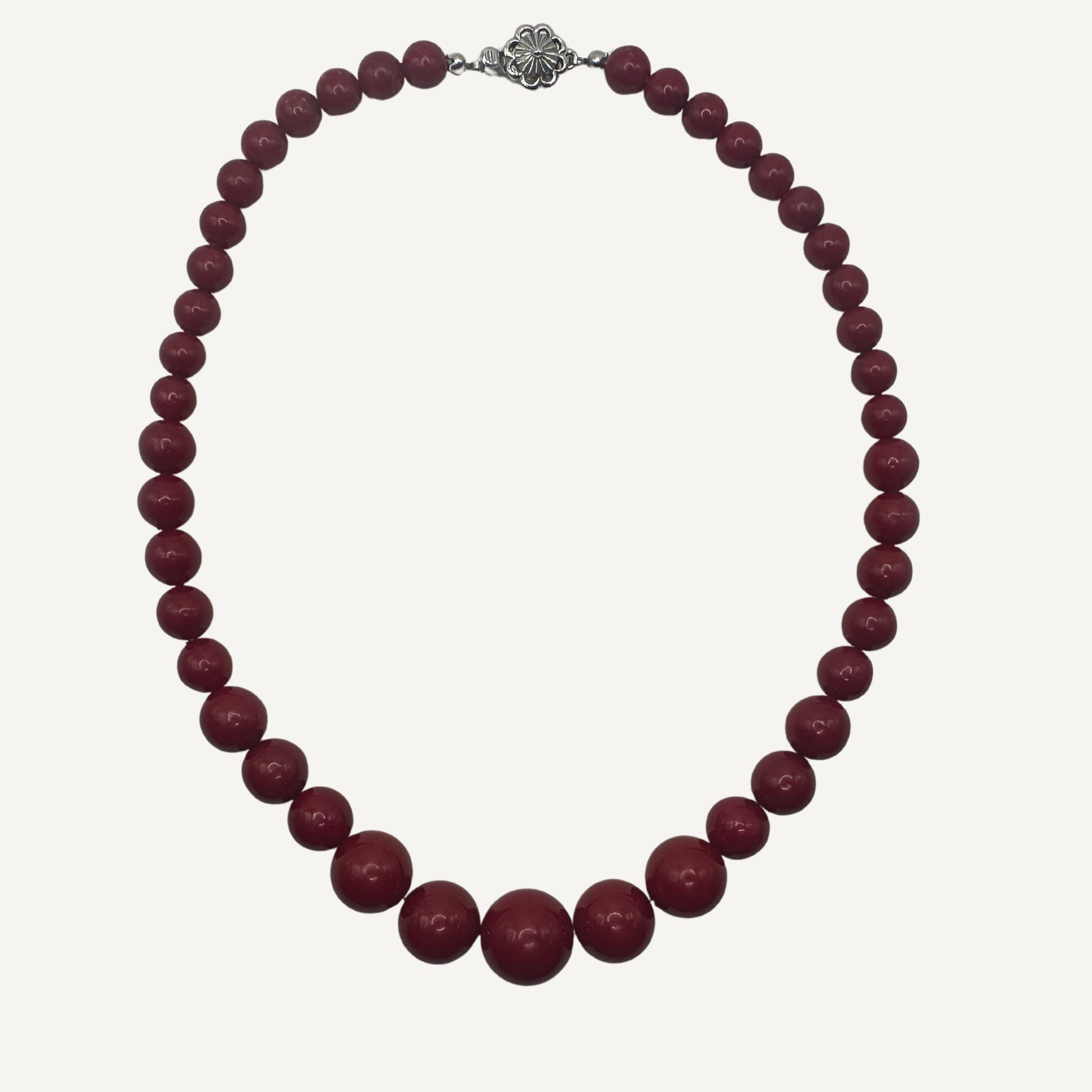 A strand of smooth, rounded beads in a deep red tone inspired by sun-warmed coastal rock. The graduated design adds quiet shape while keeping the look simple and easy to wear. Finished with a decorative clasp for a subtle detail at the back.