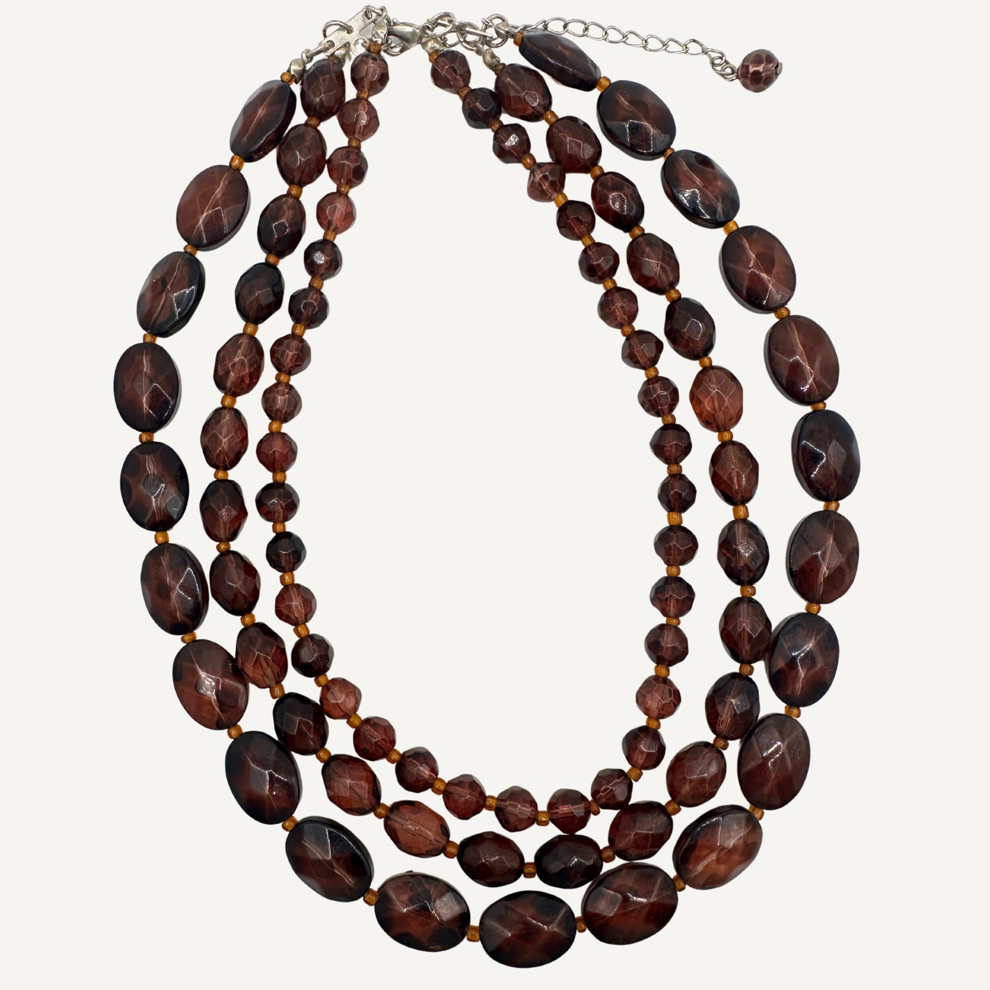 The Sun-Kissed Beads Necklace features three softly layered strands of faceted beads in deep cocoa, chestnut, and amber-brown tones. The subtle variations in color and cut create dimension and movement, giving the piece a quietly luminous quality and sun kissed glow.
