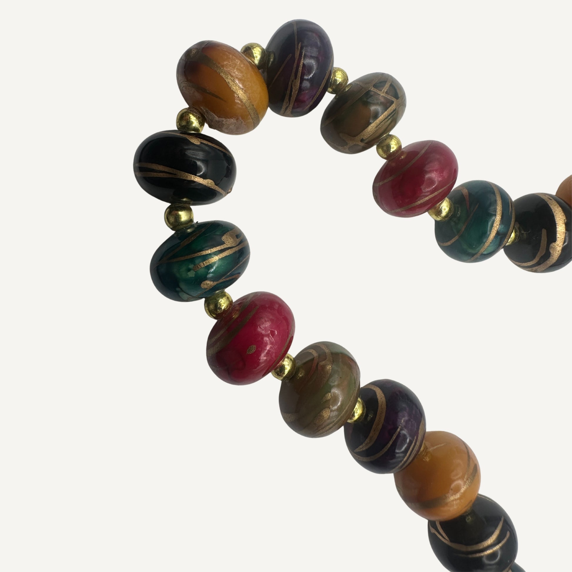 The Beach Rocks Beads Necklace is hand-strung with smooth, rounded beads in a mix of sun-warmed tones—deep teal, sandy brown, inky navy, soft olive, and hints of cherry—each separated by small metallic accents for a touch of shine.