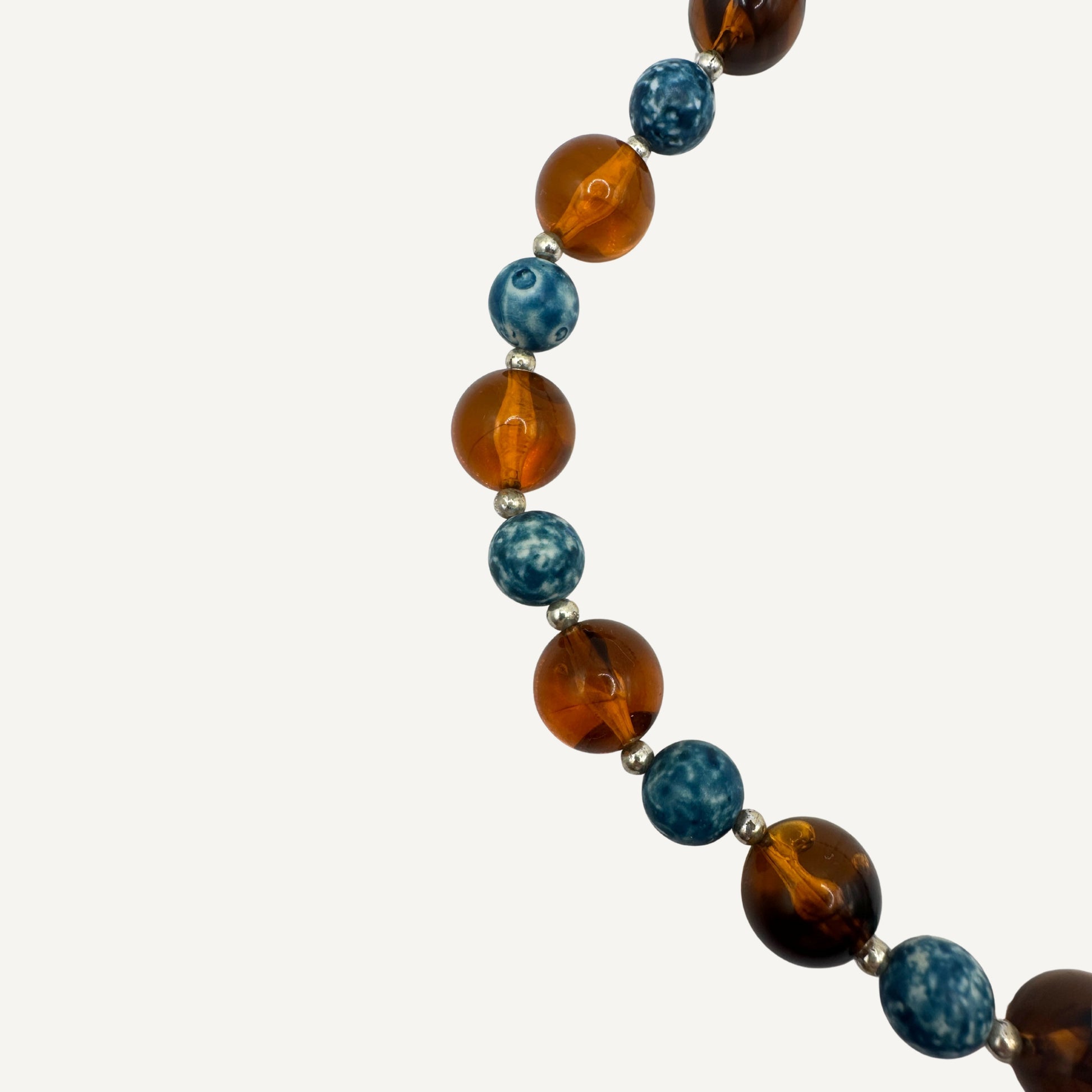 The Sunset Swim Beads Necklace pairs glossy amber-toned beads with speckled ocean-blue accents, creating a playful contrast that feels sunlit and energetic. The perfect balance of neutral and color, this necklace will be your go to for every outfit.