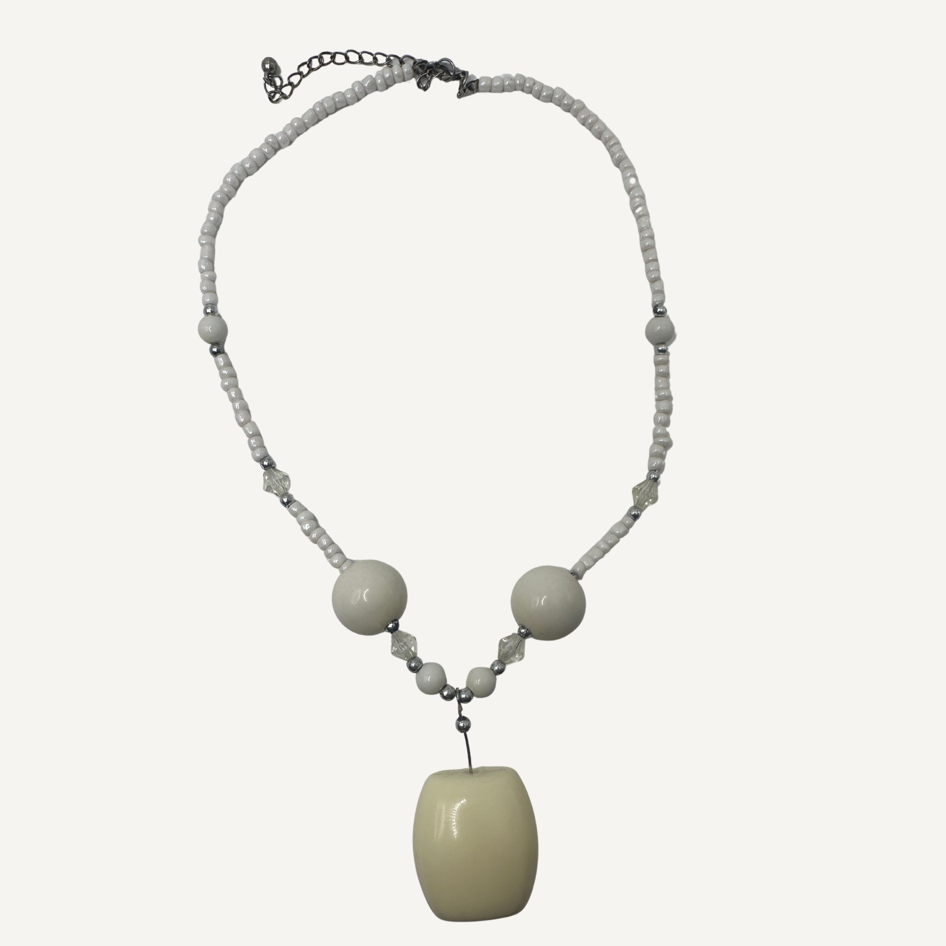 An understated essential with an artful edge. This handcrafted necklace features soft matte beads, faceted crystal accents, and a sculptural pendant that anchors the piece. Neutral in tone yet rich in dimension, it’s designed to layer effortlessly or stand alone as a statement.