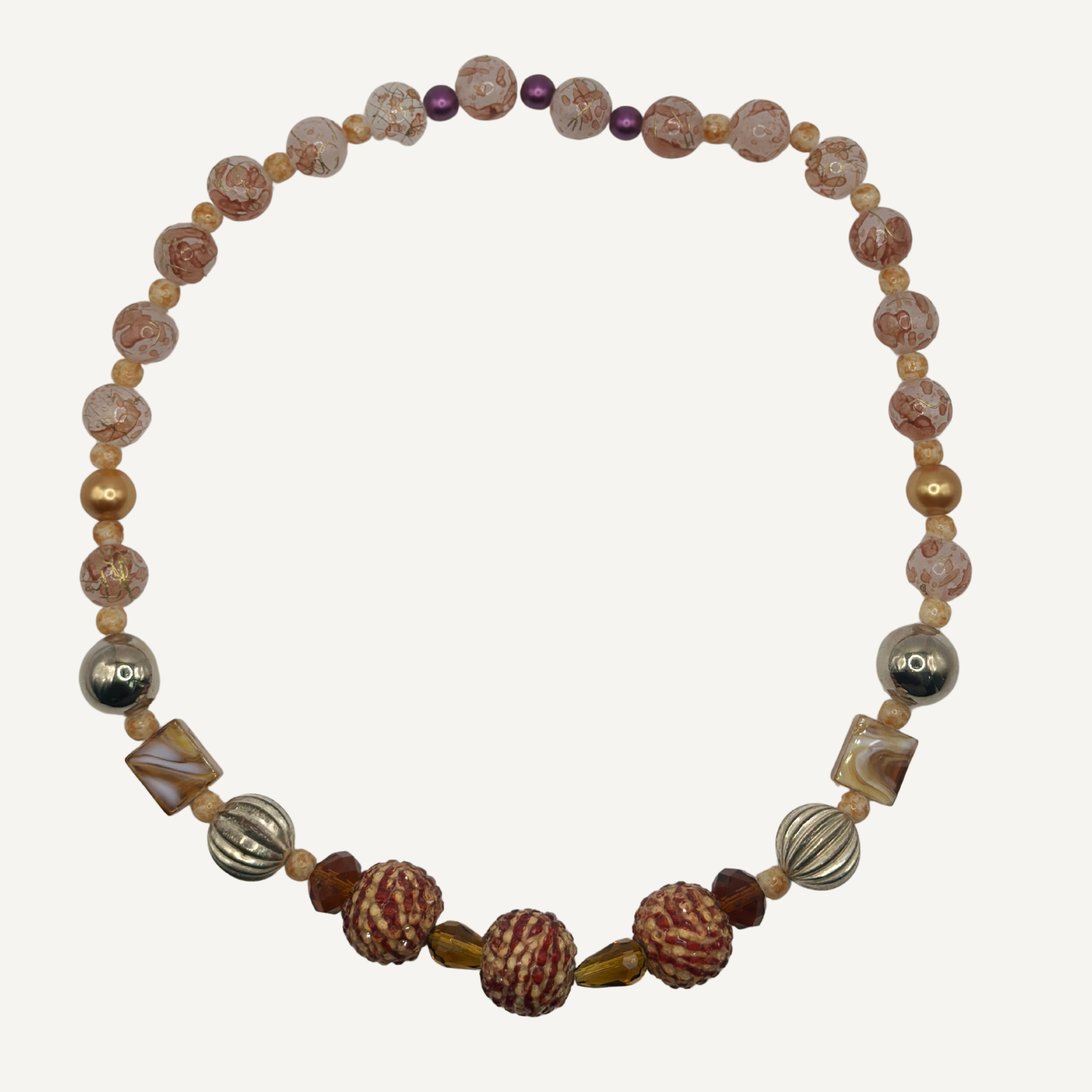 This necklace features round textured beads that resemble tiny sea urchin shells, paired with warm amber-toned faceted beads. The mix of soft red and sandy colors gives it a coastal look, like something collected from tidepools at sunset.