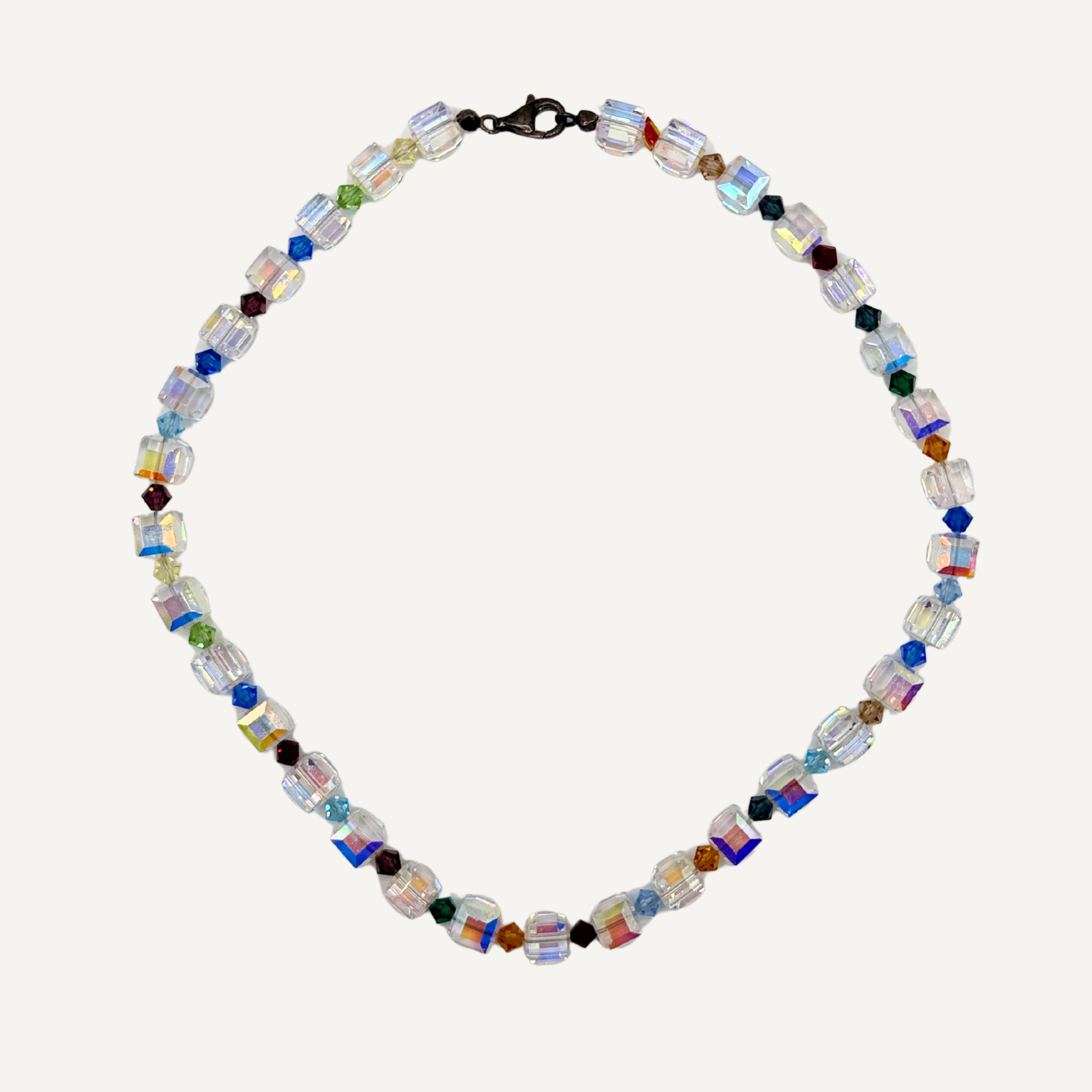 A delicate necklace made from faceted clear crystal cubes interspersed with small multicolored crystal beads. The cubes catch and reflect light, creating subtle flashes of color as the necklace moves. Lightweight and easy to layer, with a simple clasp closure.