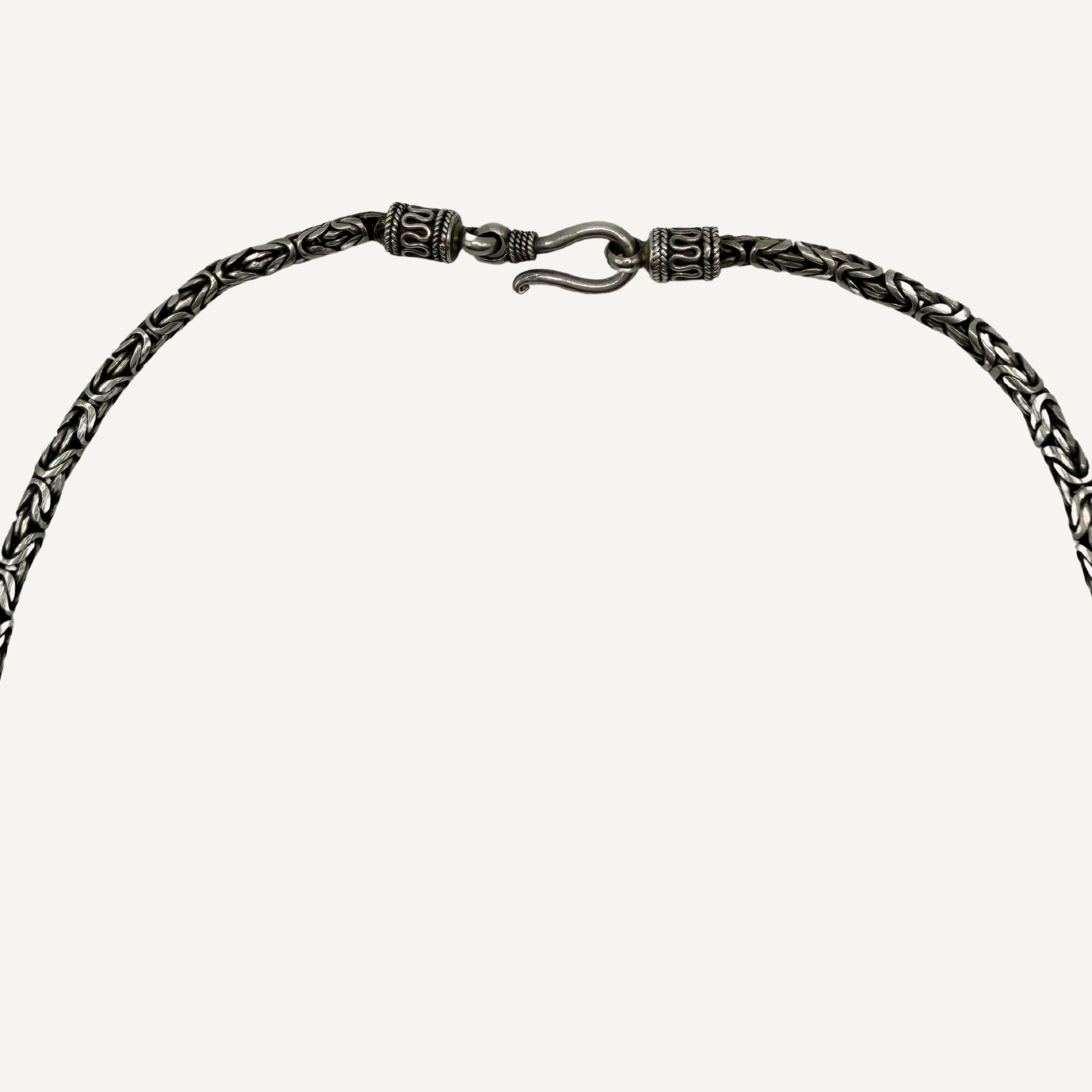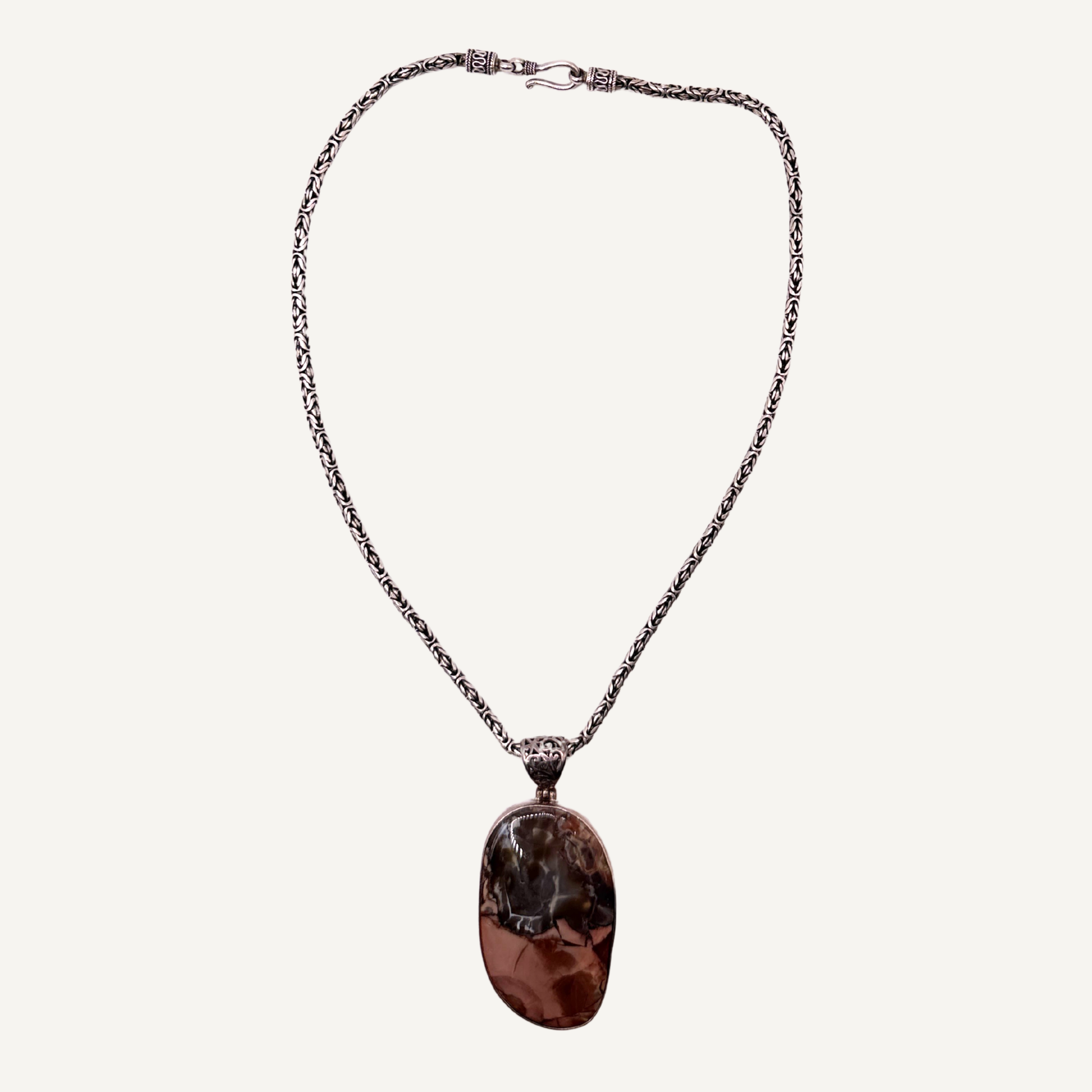 A large polished agate pendant paired with a byzantine-style chain. The agate features natural banding and depth, giving it muted, interesting pattern and tone. The chain’s woven links add weight and structure, balancing the smooth stone.