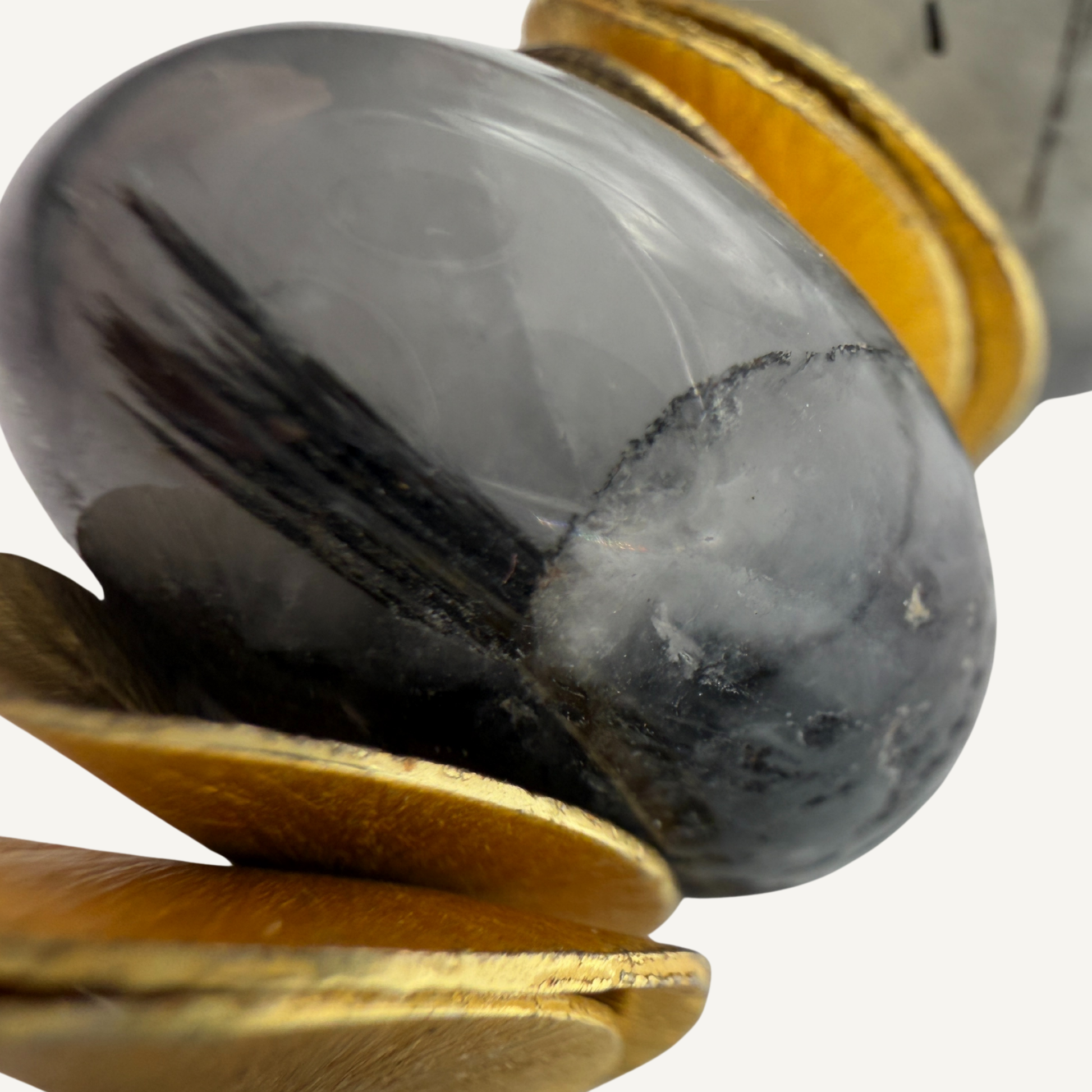 Round black quartz beads with natural inclusions, finished with subtle gold spacers, each stone unique in pattern and tone. Strung on a black cord and an adjustable closure.