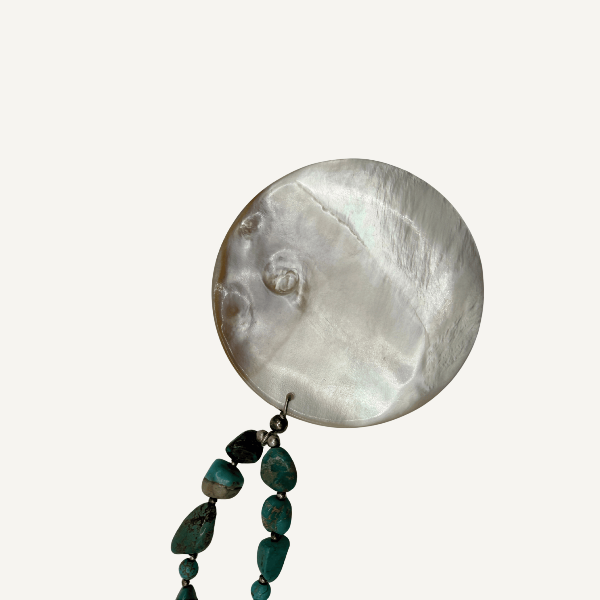 This statement necklace captures the softness of coastal mornings and the grounded beauty of natural materials. Hand-strung turquoise beads in ocean-inspired tones lead to a smooth, sculptural shell pendant that anchors the piece with quiet elegance. Each stone varies in shape and color, celebrating imperfection and the art of slowing down.